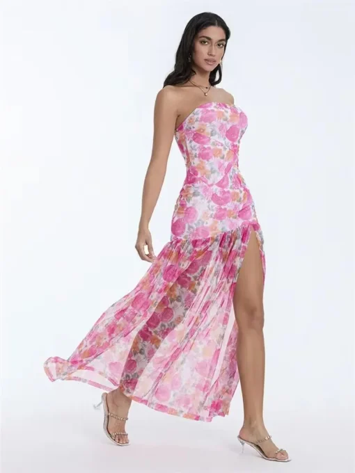 Women’s Tube Top Dress Slim Strapless Backless Mesh Patchwork Tropical Leopard Print High Slit Long Dress for Party Club Night