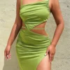 Sleeveless spaghetti strap ruched dress with drawstring, hollow out and package hip design, solid color, simple and stylish.