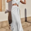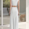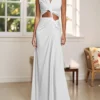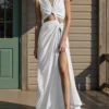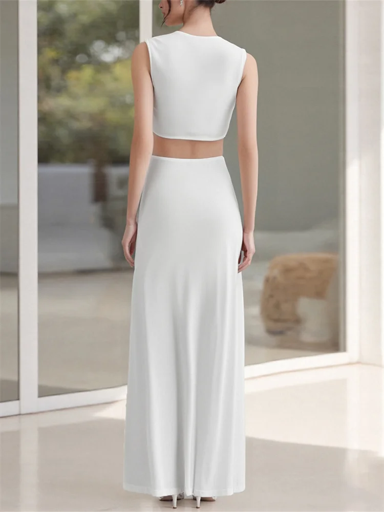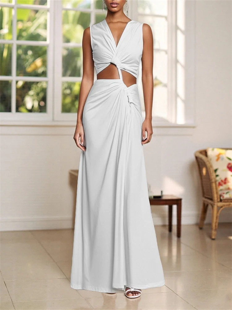 Women Long Dress Solid Color Knotted Hollow-Out High Slit Dress Summer V-Neck Sleeveless Dress for Party Evening