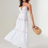 Women Summer Casual Long Dress Flower Embroidery Tie-Up Halter Neck Sleeveless Dress Fashion Backless A-line Dress
